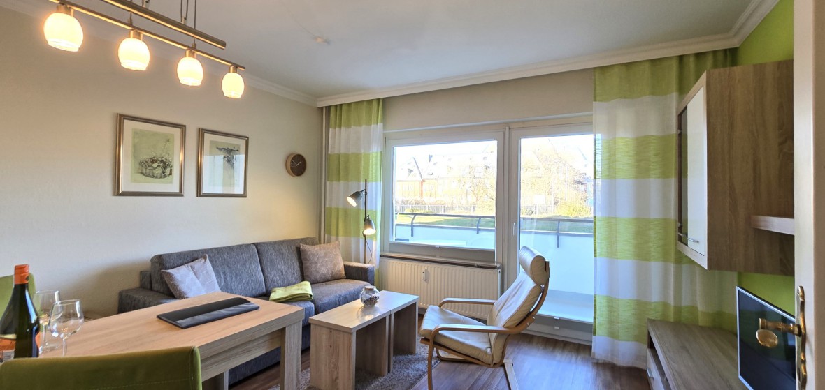 Die Wohnung besteht aus einem großen Wohnzimmer mit einem Schlafcouch (140x200cm), ofener Küche, einem Schlafzimmer mit Doppelbett und einem Duschbad. Der große Nordbalkon mit schönem Blick in die Stadt macht die Wohnung attraktiv.